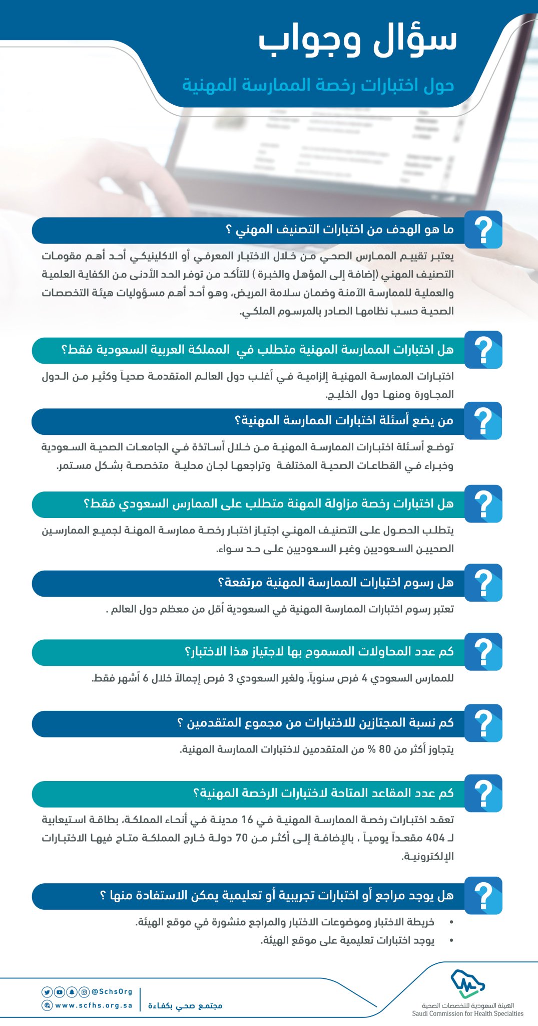 اختبار الهيئة السعودية للتخصصات الصحية يعد اختبار الهيئة السعودية للتخصصات الصحية من الا ختبارات الهامة واللازمة لأي طبيب سواء لمن سيتخصص في نوع معين أو لمن سيعمل كطبيب عام حيث يتمكن الطبيب من خلال ا جتياز هذا. أوضحت الهيئة السعودية للتخصصات الصحية أن اللائحة العامة للتصنيف والتسجيل المهني الجديدة والقواعد التنفيذية التي بدأ العمل بها بتاريخ 10 سبتمبر 2017 تضمنت تقليص صلاحية بطاقة الممارس الصحي إلى سنتين فقط وفي حال تأخير. نتائج اختبارات التصنيف المهني.
