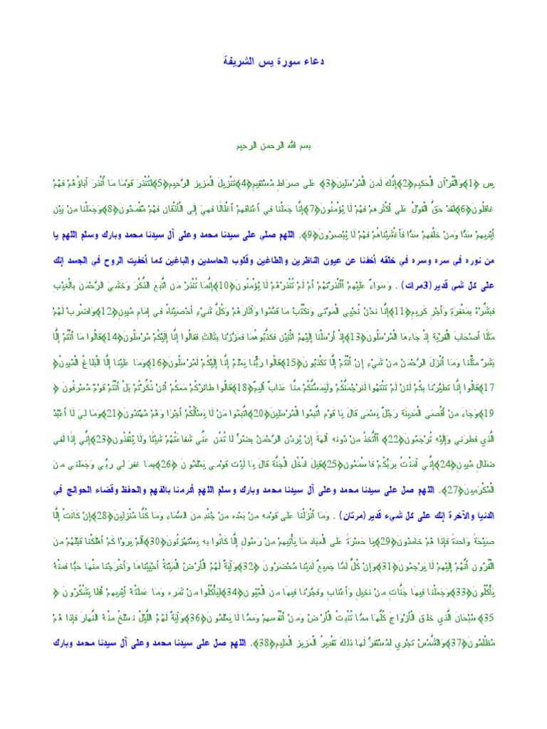 ياسين دعاء سورة يس. هل تعلم بأن دعاء سورة يس مجربة لقضاء جميع الحوائج والمطالب وتقرأ في جميع الأوقات ويستحب قراءتها يوم الخميس لطلب السعة في الرزق ويوم الثلاثاء لدفع كيد الأعداء ويوم الأحد لرفع الشأن والعزة ولطلب. نتحدث اليوم عن دعاء سورة يس وسورة يس من الصور المكية التي تتحدث عن البعث والنشور وهي من السور التي يستعين بها الكثير للدعاء بقضاء الحوائج أو فك كروب المهمومين فهي تريح قلب كل من قرأها لما لها من تأثير قوي على النفوس. دعاء بعد قراءة سورة يس من كتاب ابواب الفرج اللهم صلي وسلم وبارك على سيدنا محمد بسم الله الرحمن الرحيم بسم الله الذي لا اله الا هو الحي القيوم بسم الله الذي لا اله الا هو ذو الجلال والاكرام بسم الله الذي لا يضر مع اسمه. ألا بذكر الله تطمئن القلوب 485 731 views 3.